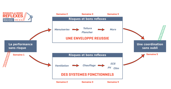 La formation est découpée en 3 parcours. Après 2 semaines d'immersion 3 parcours sont proposés en fonction de votre avancement. Un premier parcours Fondation, permet de lancer une dynamique dans sa copro pour partir sur de bonnes bases. Un second parcours Échafaudage du projet permet de bien comprendre tous les acteurs en jeu dans un projet de rénovation et comment bien aborder la phase étude et avant projet. Enfin le dernier parcours sur les travaux permet d'aborder sereinement la phase travaux et enfin la réception.